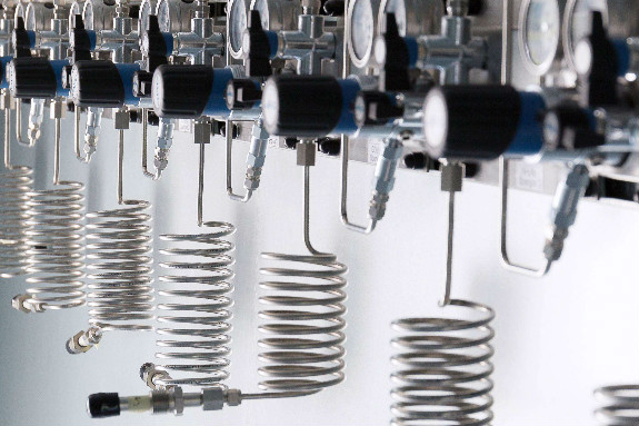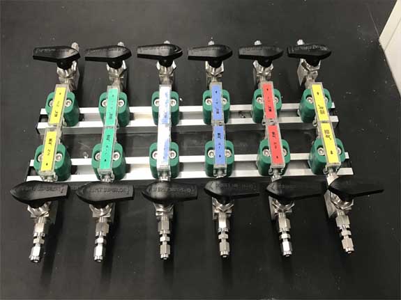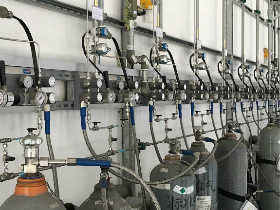 实验室用气主要有不燃气体(氮气、二氧化碳)、惰性气体(氩气、氦气等)、易燃气体(氢气、一氧化碳);剧毒气体(氟气、氯气);助燃气体(氧气)组成。除不燃气体、惰性气体外其它气体不得进行实验室。可以通过输气管接到各实验室内。一般气相室配置氦气(He)、氮气(N2)。气质联用室配置了氮气、氢气、氧气。氢气管线上的连接管件都要连接后焊接,严禁有泄漏的可能。所有的管线在安装完毕后一定要做气密性实验,并在使用前要先除油。由于管道细小,管间距小,安装过程中可依据现场情况进行调整,保证间距不小于45mm,气瓶装瓶时,易燃易爆与惰性气体同柜,杜绝两种易燃气体同瓶装一柜。
